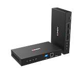 Dieser Extender verfügt über Status-LEDs und ein OLED-Display, um die IP-Adresse anzuzeigen und Zugriff auf Menüfunktionen zu haben, eine Web-GUI für die vollständige Konfiguration und API-Befehle, um flexible Konfigurationen zu erreichen, auch von Steuerungssystemen von Drittanbietern.